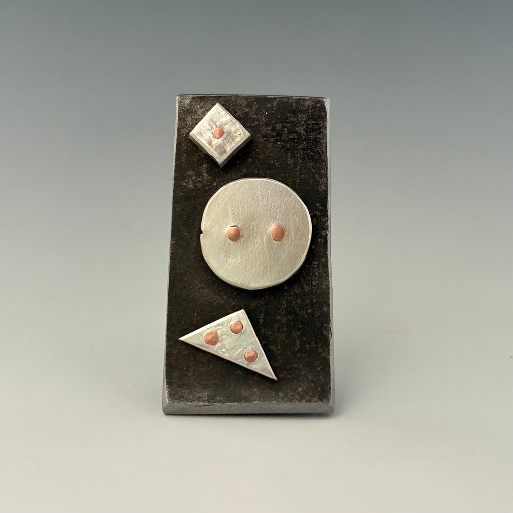 Three sterling and fine silver shapes have been riveted to the steel base with copper wire. The brooch is held up on the back via a neodymium magnet. Dimensions: 1.5" x.75" x 3/32" (40mm x 20mm x 2mm).